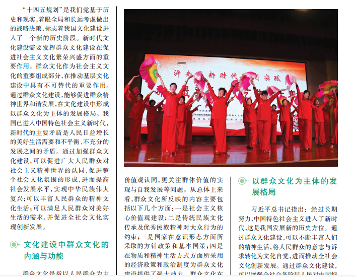 在新时代文化建设中,需要进一步丰富群众文化建设的内涵。在多元文化格局下,群众文化建设要加强理论研究,以群众文化为主要内容展开理论探讨,以推动基层文化建设。