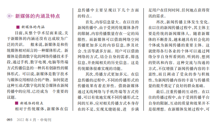 新媒体的出现,不仅丰富了新闻传播的载体形式,而且提升了新闻传播的效能。目前,学术领域关于新媒体的特点和新媒体在新闻传播中的价值与意义已经展开了较为丰富的研究。