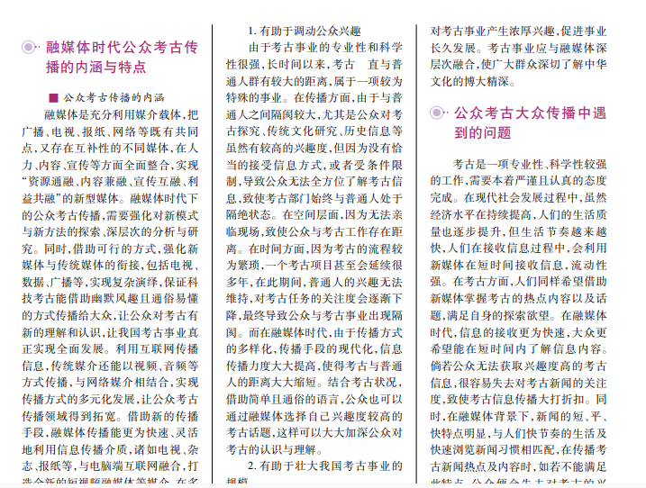 进入 21世纪以来,移动互联网的全面推进使得传播形式和方法发生很大变化。在此种背景下,相对小众化的考古事业借助融媒体多样化传播的方式,可以极大地提升公众的参与度和体验感,引领公众深入了解考古事业,促进公众考古的发展,提高大众传播的效率。