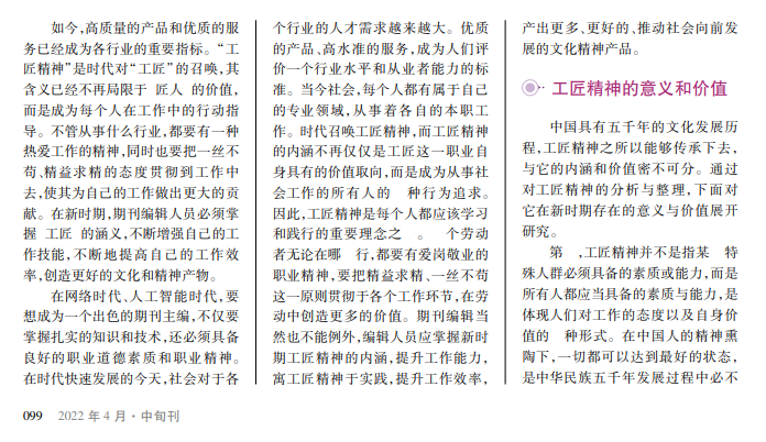 新时代对期刊编辑综合能力提出了更高的要求,需要编辑从业人员强化工匠精神,明晰工匠精神的实际内涵,对自身工作行为要求更严格,职业操守更加规范化,要不断提高个人能力,灵活处理期刊编辑过程中所遇到的各种问题,推动期刊质量高水平发展。