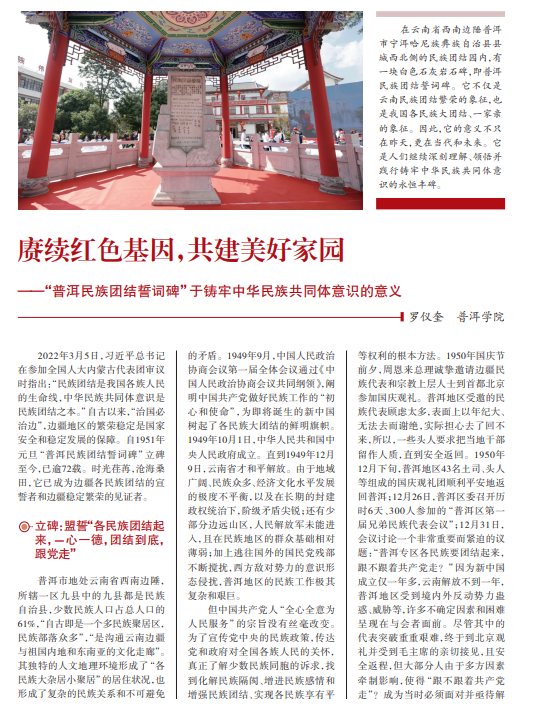 在云南省西南边陲普洱 市宁洱哈尼族彝族自治县县 城西北侧的民族团结园内,有 一块白色石灰岩石碑,即普洱 民族团结誓词碑。它不仅是 云南民族团结繁荣的象征,也 是我国各民族大团结、一家亲 的象征。因此,它的意义不只 在昨天,更在当代和未来。它 是人们继续深刻理解、领悟并 践行铸牢中华民族共同体意 识的永恒丰碑。