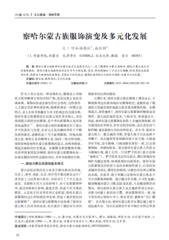 察哈尔蒙古族服饰作为蒙古族文化表现形式之一,是了解察哈尔蒙古族特征、察哈尔蒙古族文化的重要载体。察哈尔蒙古族服饰在历史长河中不断发展、演变,新时期融合了不同文化精髓,吸收周边民族装饰元素,保持自己独特的民族特色,呈现出以时尚表达、展现民族传统文化的设计趋势,向着多元化发展。