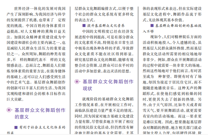 舞蹈表演作为一种历史悠久的文化表现形式,逐步从舞台进入大众生活,成为民众生活的文化组成部分。在我国群众文化发展过程中,群众舞蹈艺术已相对成熟。