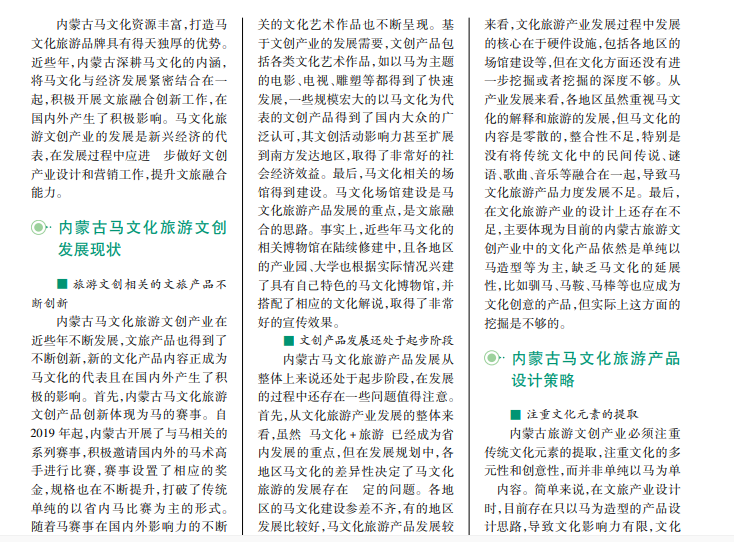 “旅游 +马文化”已经成为内蒙古文旅融合的新亮点。基于马文化设计的旅游产品深受游客的喜爱。文创产业是马文化的产业链之一,在产业设计和营销方面符合社会发展的需要,也得到了文旅各界的支持和欢迎,研究内蒙古马文化旅游文创产业设计营销策略具有现实意义。