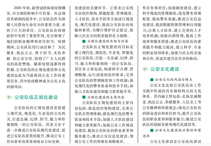 新型冠状病毒疫情爆发以来,公安队伍在抗击疫情中发挥了重要作用,进一步彰显了职业精神和责任担当,抗疫精神成为公安文化的新风向。加强公安队伍的文化建设和正规化建设,为保障人民群众生命安全和社会稳定作出更大贡献,这对公安队伍素质提升和形象塑造具有重要意义。