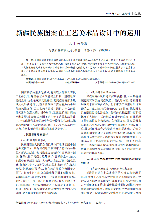 新疆民族图案具有独特的艺术风格和深厚的文化内涵,为工艺美术品设计提供了丰富的素材和灵感,不仅丰富了工艺美术品的种类和风格,提升了作品艺术价值,而且能够推动中华优秀传统文化传承与发展。本文概述新疆民族图案的形成与风格特征,分析新疆民族图案在工艺美术品设计中的价值,提出在工艺美术品设计中运用新疆民族图案的策略,以期创作出更具民族特色和现代感的工艺美术品,推动新疆民族文化传承与发展。