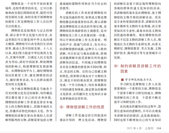 博物馆讲解是博物馆宣传与教育工作的核心,而讲解员是讲解工作的灵魂和核心,也是博物馆对外宣传展示的窗口形象。讲解工作关系着观众对博物馆的印象评价。