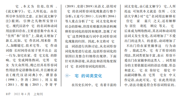 “宅”一词在西周时期就已经有名词“住所”的意义并被大量使用。随着社会发展,其词义在有名词、动词功能的情况下,受日本“宅”文化影响,在现代汉语中又具有了形容词词性,形容人不爱出门。