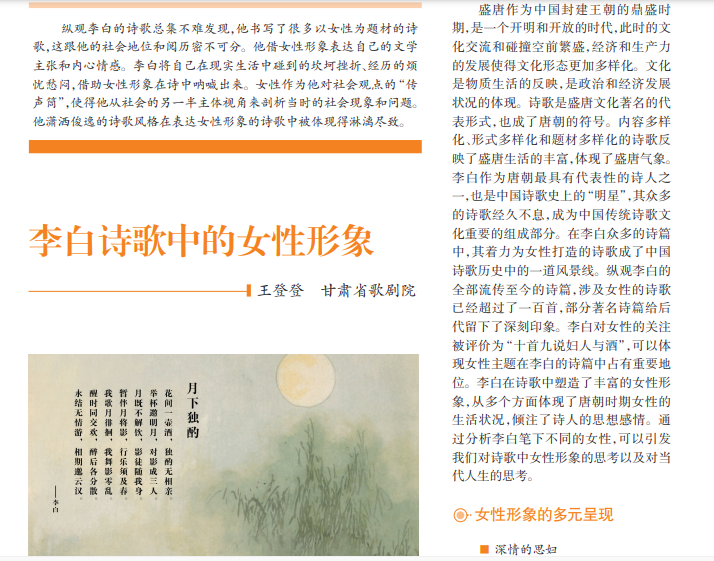 纵观李白的诗歌总集不难发现,他书写了很多以女性为题材的诗 歌,这跟他的社会地位和阅历密不可分。他借女性形象表达自己的文学 主张和内心情感。李白将自己在现实生活中碰到的坎坷挫折、经历的烦 忧愁闷,借助女性形象在诗中呐喊出来。女性作为他对社会观点的“传 声筒”,使得他从社会的另一半主体视角来剖析当时的社会现象和问题。 他潇洒俊逸的诗歌风格在表达女性形象的诗歌中被体现得淋漓尽致。