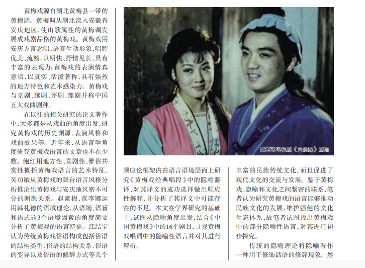 黄梅戏源自湖北黄梅县一带的 黄梅调。黄梅调从湖北流入安徽省 安庆地区,使山歌属性的黄梅调发 展成戏剧品格的黄梅戏。黄梅戏用 安庆方言念唱,语言生动形象,唱腔 优美、流畅,以明快、抒情见长,具有 丰富的表现力;黄梅戏的表演情真 意切,以真实、活泼著称,具有强烈 的地方特色和艺术感染力。黄梅戏 与京剧、越剧、评剧、豫剧并称中国 五大戏曲剧种。