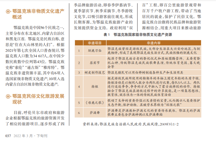 非物质文化遗产是人类精神文明和生活智慧的结晶。呼伦贝尔市鄂温克族非遗资源丰富,本文将非 遗传承与发展民俗文化相结合,分析鄂温克族民俗文化旅游产业发展现状,找出鄂温克族非遗传承在民俗 旅游发展中存在的问题并提出解决措施,以期为鄂温克旅游发展提供参考。