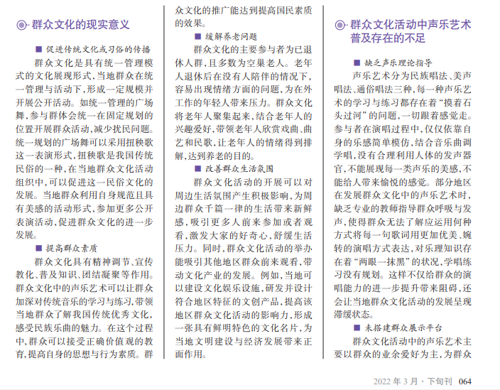 随着生活水 平逐渐提高,人们 对精神的需求愈 加显著。声乐艺 术具有强大的感 召力,能够将人民 群众以最快的速 度聚集起来,拉近 邻里之间的距离, 促进当地构建和 谐文明社会。