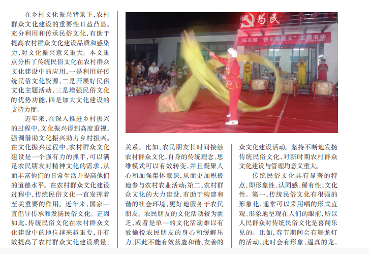 在乡村文化振兴背景下,农村 群众文化建设的重要性日益凸显。 充分利用和传承民俗文化,有助于 提高农村群众文化建设品质和感染 力,对文化振兴意义重大。本文重 点分析了传统民俗文化在农村群众 文化建设中的应用,一是利用好传 统民俗文化资源,二是开展好民俗 文化主题活动,三是增强民俗文化 的优势功能,四是加大文化建设的 支持力度。