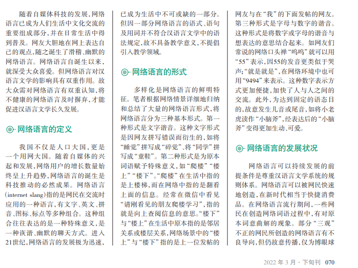 当前,网络文化已成为时代潮流的一部分。一些幽默的网络用语被大众广泛应用,其对汉语言文学也 产生了一定影响。汉语言文学是中华文化传播的重要途径,历史悠久,其地位是网络语言无法比拟的。在文 化交融的时代背景下,如何将网络语言与汉语言文化进行充分融合,已成为我国文化发展要解决的重要问题。