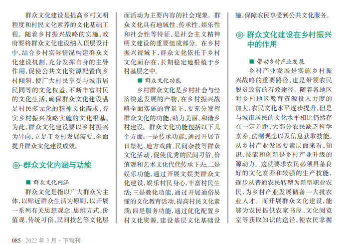 在乡村振兴 战略全面实施的 背景下,群众文化 建设在带动乡村 产业发展,加快乡 村生态文明建设, 助力乡村高效治 理,打造和谐、美 丽乡村以及提高 村民生活质量方 面发挥着不容忽 视的作用。