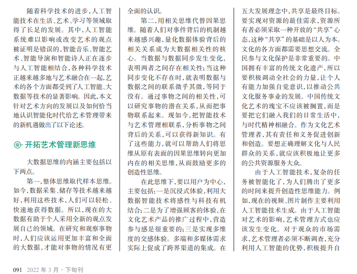 在大数据和智能时代,人 工智能技术对艺术和生活的各 个方面发展都产生了极大的影 响。数字化转型深刻影响了文 化产品生产、流通和消费的创 新。尽管数据驱动的创新和人 工智能已被证明在许多领域都 能有效地创造价值,但艺术管 理采用数据生态系统的速度仍 然较慢。大数据人工智能技术 为艺术管理提供了发展方向, 对此我们仍然需要认真考虑, 以促进学科的长期发展。