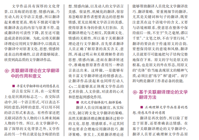 随着全球文化的交融,各 个国家的文学艺术作品也在大 范围地交叉传播,文学翻译需 求显著增长。为了保证文学翻 译的品质,应将关联翻译理论 应用在文学翻译中,并作为一 项关键课题,积极地研究、探讨 与实践。一方面,要正确理解 关联翻译理论的概念,认识到 关联翻译理论在文学翻译中的 作用和意义;另一方面,要基于 关联翻译理论采取正确的翻 译方法,“原汁原味”地转述和 表达原著所包含的文化、思想、 情感。