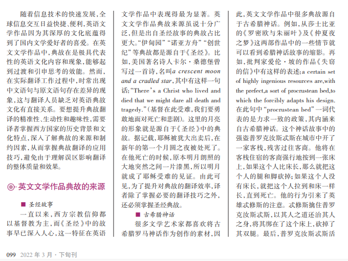 在国际化的发展进程 中,随着中英文化的深入交 融,英文文学被大众广泛关 注和认可。典故作为文学作 品中的精华,蕴含着深厚的 文化底蕴。典故不仅对欧美 文学产生了重要影响,也是 中英文学交互的关键要素。 英语文学作品典故来源广 泛,在解读翻译时需要综合 考虑各种因素,合理、熟练地 运用直译法、意译法、增译法 和套译法,同时采用与之对 应的翻译技巧,确保符合文 学作品的主题思想,以期达 到信、达、雅的翻译效果。