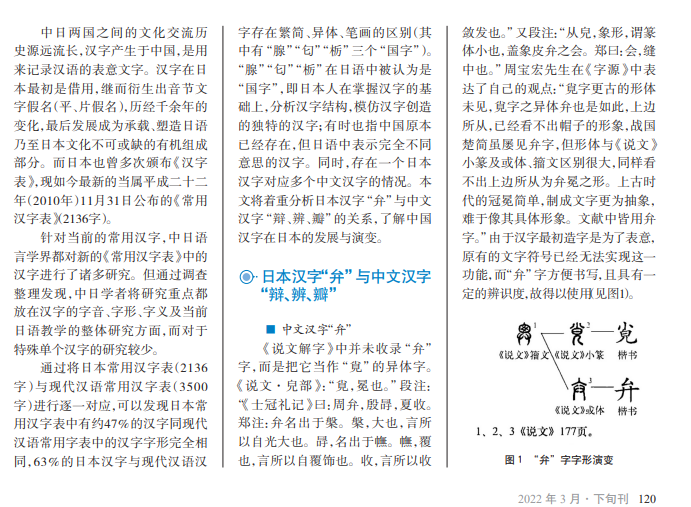 日文汉字“弁”有分 辩、辨别、花瓣等含义,与 中国汉字“弁”字义完全不 同。中国汉字“弁”传播到 日本后,日文摒弃了中国汉 字“弁”的原有常用字义、 只保留其字形和字音、同时 借助“辩、辨、瓣”的基础义 进行加工改造赋予“弁”字 全新的意思,使其成为日文 常用汉字。从汉字在日本 的传播发展史来看,一方 面,我们要树立民族自信和 文化自信;另一方面,我们 要成为汉字传播的宣传者, 将中国汉字发扬光大。
