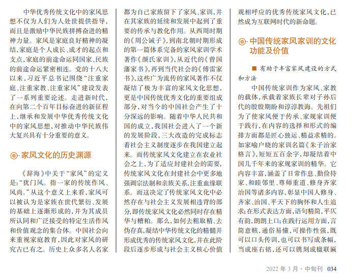家是最小国,国是千万家, 家风与政风、社会风气紧密相连。 古今中外的历史都证明了这样 一个道理:“家风好,就能家道兴 盛、和顺美满;家风差,难免殃及 子孙、贻害社会,正所谓‘积善之 家,必有余庆;积不善之家,必有 余殃’。”并号召广大家庭尤其是 领导干部家庭要建设好家风,支 撑起全社会的好风气。中国传统 家训文化在构建家风方面传递着 丰富的思想理念,蕴藏着无穷的 经验和智慧,是新时代家风建设 必不可少的理论根基。