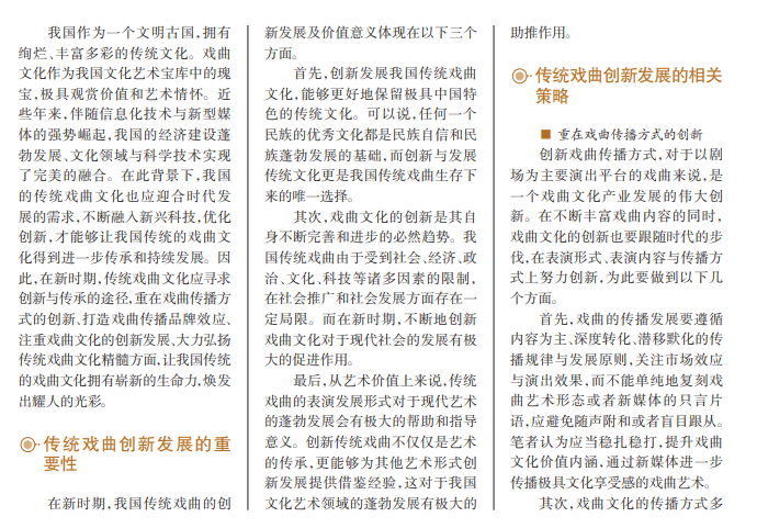 戏曲作为我国优秀的传 统艺术之一,在我国五千年的 历史长河中,凝结了璀璨的艺 术精华,反映了中华民族高超 的文化艺术水平。戏曲能够丰 富人的精神生活,提升人的文 化情操,戏曲文化是我国宝贵 的文化财富。如何在新时期传 承和创新我国戏曲文化,是文 艺工作者必须要深刻思考的 问题。