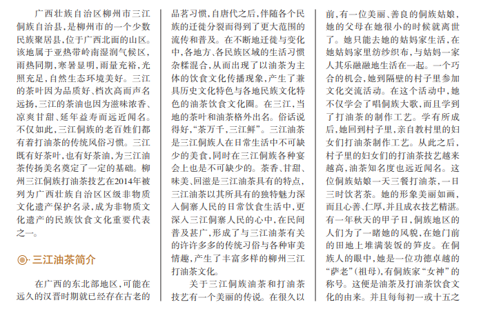 广西壮族自治区的恭城、灌 阳、三江、平乐这四个县的油茶技 艺膺选广西区级非物质文化遗产 保护名录,三江油茶技艺就是其中 最具代表性的油茶技艺之一。三 江侗族在很久以前就有打油茶的 饮食习惯,在三江居住过一段时间 的人,都会喜欢上喝油茶。三江侗 族人民从很久之前就开始种植茶 叶,一代一代地流传下来。直到现 在,喝油茶依旧是三江侗族人最主 要的饮食习惯。