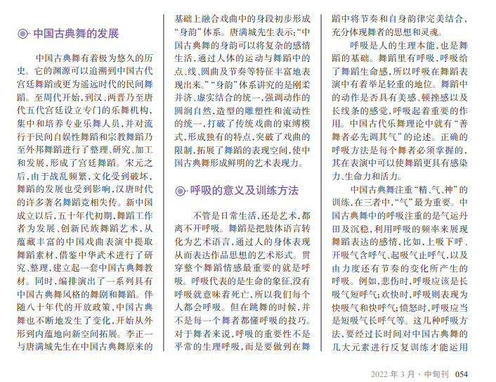 生命的象征在于呼吸, 有了呼吸才有了生命。有生 命的存在,舞蹈才有了价值。 在中国古典舞中,除了可以 用身体的运动表达情感之 外,更重要的是用呼吸控制 肢体,使舞者做出更加为完 美的动作,从而淋漓尽致地 表达心声和意境。呼吸在中 国古典舞中有着举足轻重的 地位,如果舞者在跳舞时没 有正确地运用呼吸,那么舞 蹈就会显得没有灵魂。