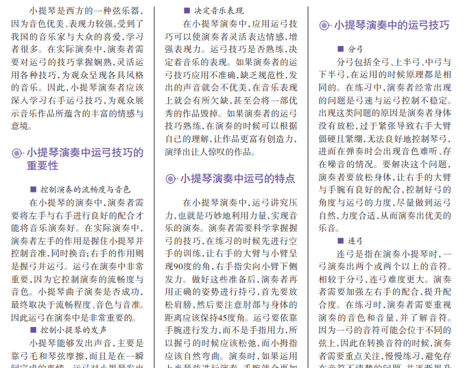 在小提琴演奏中,演奏者需要保持正确的站立姿势与运弓姿势,左右手之间要有良好的配合。很多演 奏者更加重视左手的技巧,而对右手运弓的技巧有所忽视。