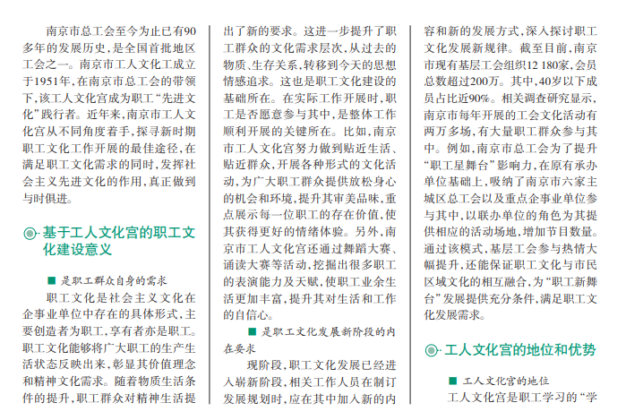 随着我国公共文 化服务体系建设逐步深 入,职工文化建设有了 新的内涵。从职工文化 建设角度来看,工人文 化宫具有不可或缺的作 用,必须紧跟时代发展 潮流,确定职工文化需 求之所在,在确定自身 定位的同时创新更多的 工作模式。