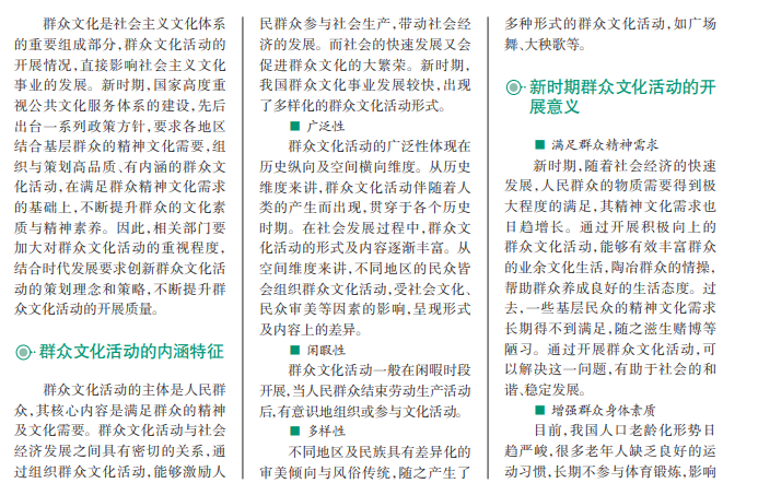 新时期,人民群众的物质生活水平得到大幅度提升,对精神文化生活的需求呈现日益增长的态势。通 过组织与策划群众文化活动,能够满足群众的精神文化需求,进一步完善公共文化服务体系,推动社会和 谐稳定发展。