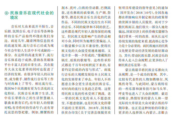 在流行音乐和网络媒体高 速发展的时代,尽管民族音乐与 流行音乐创作融合一直在进行, 但民族音乐仍面临失传的风险, 其主要原因是老一辈继承人不 愿意改变传统观念以及年轻人 对流行音乐的向往和对传统文 化的忽视。因此,在民族文化与 流行音乐结合的过程中,正面与 负面影响是在文化碰撞中最需 要被重视的。如何将民族音乐的 创作从求“量”转变为求“质”, 让民族文化能够带动民族地区 的经济发展以及可持续发展是 值得探索的问题。