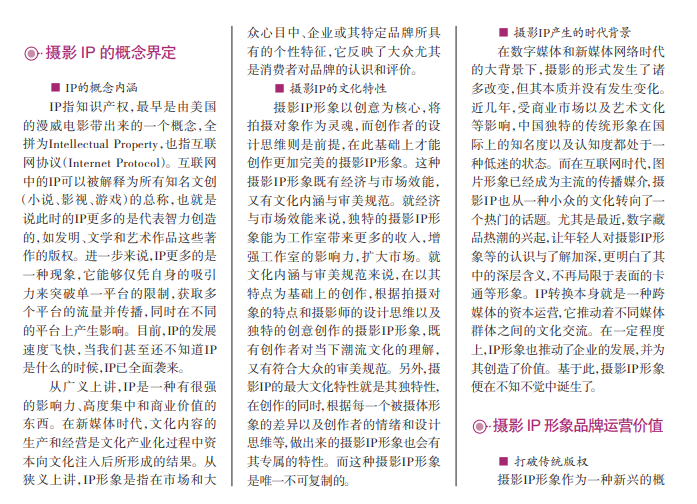 随着时代 的发展与数码 传媒的普及,摄 影越来越被大 众所接受,但传 统摄影市场已 经趋于饱和,旧 的摄影模式已 跟不上时代发 展的潮流。在 新媒体背景 下,运用“摄影 +IP”形象的运 营模式显得尤 为重要。