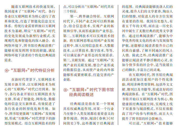 在互联网时代,因 新媒体和智能手机的普 及,读者阅读需求趋向多 元化、个性化,阅读内容 偏向娱乐化,而且阅读目 的非常明确。经典作为 中华文化的精髓,对传承 和保护中华优秀传统文 化有着积极意义。图书 馆的重要工作之一就是 开展经典阅读推广。