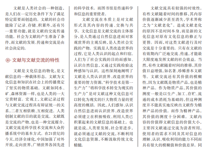 文献是物化的信 息,是人类认识世界、改 造世界的重要的智力资 源。文献通过图书馆、 情报中心、书店、网络等 中介机构的传递服务于 社会,其传递、交流手段 从传统走向现代化,对 人类社会起到了举足轻 重的作用。