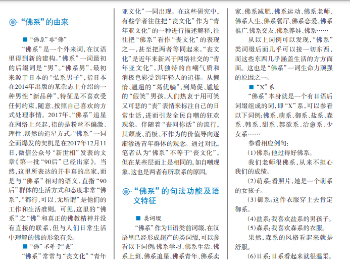 福 柯 认 为 ,“ 认 同是一个蕴含在社会 实践中的过程,而话 语是构成社会实践的 核心内容”。虽然语 言不等于话语分析, 但也体现了语言与身 份认同之间的紧密联 系。“佛系”的流行,不 仅是语言的发展,而 且体现了其主体的思 想维度,寻求自我认 同的趋势,预示了它 将比其他流行语的生 命力更加顽强。
