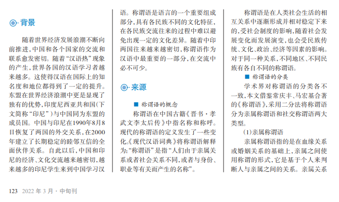 称谓语是语言的一个重要组成部分,具有各民族不同的文化特征,在各民族交流往来的过程中难以 避免出现一定的文化差异。中国和印尼两国往来越来越密切,称谓语作为汉语中最重要的一部分,在交流 中必不可少。