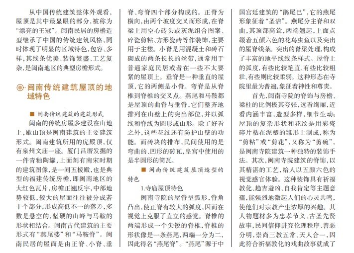 中国建筑的上部结 构——屋顶,是中国数千年来 建筑历史的一种表现形式,它 与中华的文化和理念融合在 一起。闽南民居是中国传统 建筑学的一个重要组成部分, 其屋檐上的“意匠”融合了闽 南的文化与观念。