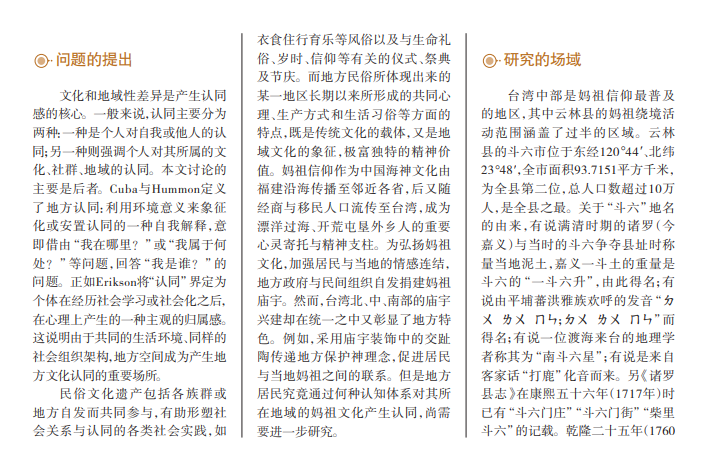 文化和地域性差异是产生认同 感的核心。一般来说,认同主要分为 两种:一种是个人对自我或他人的认 同;另一种则强调个人对其所属的文 化、社群、地域的认同。本文讨论的 主要是后者。Cuba与Hummon定义 了地方认同:利用环境意义来象征 化或安置认同的一种自我解释,意 即借由“我在哪里?”或“我属于何 处?”等问题,回答“我是谁?”的 问题。正如Erikson将“认同”界定为 个体在经历社会学习或社会化之后, 在心理上产生的一种主观的归属感。 这说明由于共同的生活环境、同样的 社会组织架构,地方空间成为产生地 方文化认同的重要场所。