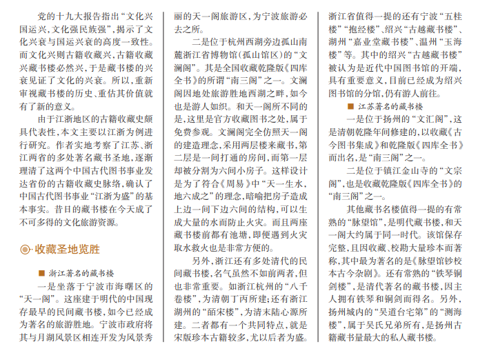 江浙古籍图书 收藏事业历来十分 兴盛,但近代以来屡 遭重大劫难。面对 部分人对藏书楼意 义的诘难,有必要理 性分析官、民藏书楼 在保护中华民族传 统文化典籍上作出 的不可替代的历史 贡献;同时,也应挖 掘江浙两省的藏书 楼在当今文化旅游 中的地方价值。