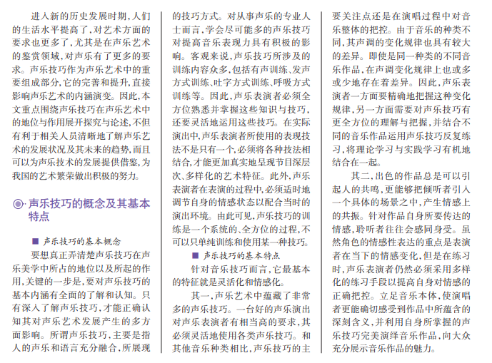 随着我国社会物质生活 和精神生活水平的双重提高, 人民群众对音乐艺术的重视 程度和鉴赏水准也日益提升, 音乐艺术迎来了良好的时代 发展期。声乐技巧是声乐艺 术中非常重要的部分,发挥着 不可替代的作用。客观而言, 声乐技巧有其自身的特点和 规律,可以充分展示声乐艺术 的独特美感和形式美,促进声 乐艺术在演唱与创作领域的 完善与提升。