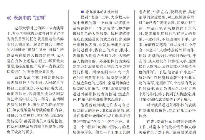 一名优秀的戏剧 演员,必须经过大量的 专业训练和舞台实践来 打磨。高校表演系四年 的学习训练有一个共同 的核心要求,那就是,体 会“控制与松弛”对演 员表演的重要意义。何 为“控制”?何为“松 弛”?简单地从字面来 理解,两者并不复杂。 但如果将其归结到戏剧 表演的专业范畴内,就 有了更为深刻的内涵。