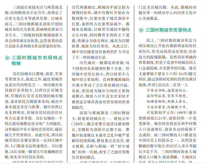 三国时期是中国古建筑发展历史中城市设计规划承前启后的重要代表。城市街景以电影美术来还 原三国史,建筑史与影视建筑学相结合而产生了极有意义的课题。