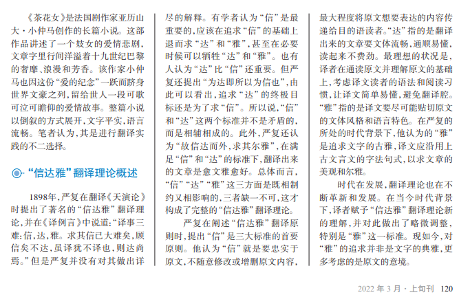 严复先生是公认的翻译理论 大家,其最具代表性的理论无疑是 他在翻译《天演论》时提出的“信达 雅”翻译标准。也有学者对该翻译 理论提出过质疑与批评,但笔者认 为,无论是哪一种翻译理论都没有 办法对每一种翻译现象做出合理的 解释,重要的是该理论对翻译研究 与实践的指导意义。