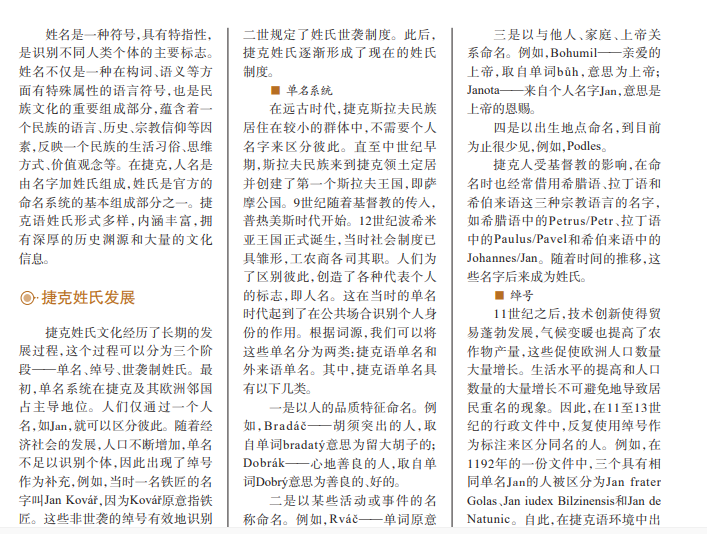 13世纪至今,捷克历史文明 的发展与演变在捷克语言的变 化进程中得以体现。其中,姓氏 文化是捷克民族特性的重要组 成部分。