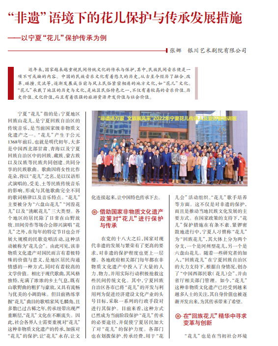 近年来,国家越来越重视民间传统文化的传承与保护,其中,民族民间音乐便是一 项不可或缺的内容。中国的民族音乐文化有着悠久的历史,从古至今经历了融合、改 革、碰撞、交流等,逐渐发展成当前与风土民俗紧密相连的地方文化,如“花儿”文化。 “花儿”承载了地区的历史与文化,是地区民俗特色之一,不仅有着较高的音乐价值、历 史价值、文化价值,而且有着很强的旅游资源开发价值与社会价值。