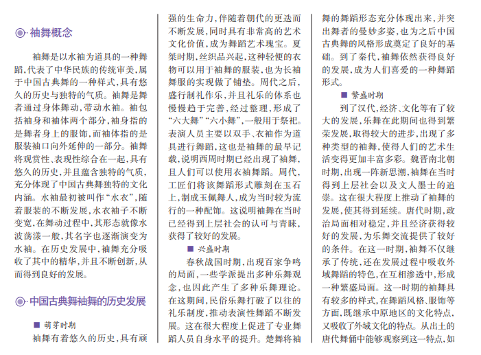 中国古典舞承载着 传统文化,袖舞作为中 国古典舞的一种,充分 体现了中国舞蹈的文化 精神与民族审美观。在 不同的历史时代,袖舞 被赋予不同的品格,体 现了中国古典舞的精神 面貌。袖舞的发展代表 的是中华历史与文化的 艺术传递。汉代时期, 袖舞迎来发展高峰。当 代古典舞在创新的同 时,也促使袖舞技术得 到突破,使之产生了新 的气息与温度。