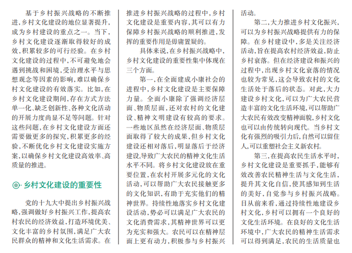 乡村文化建设是新时代农村 发展的重要举措,是乡村振兴战略 的重点内容及精神支撑,旨在帮助 农村打造良好的文化氛围,满足人 民群众的精神生活和文化生活的 需求。党的十九大以来,乡村振兴 战略得以有效推进,乡村文化建设 也取得较好成效。要持续性地推 进乡村文化建设活动,提升文化自 信,为乡村振兴奠定坚实的精神 基础。