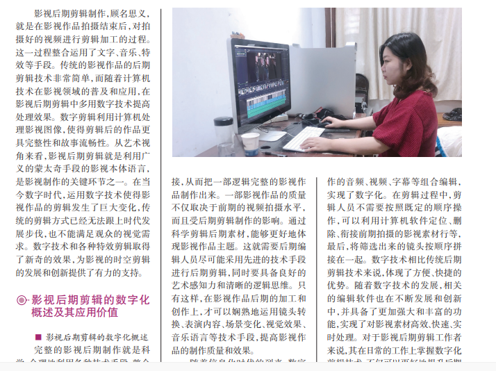 数字化时代,高科技在影视剪辑中的应用,使得影视艺术实现了多元化发展,极大地推动了影片的拍 摄和制作技术向更高的水平发展,呈现越来越惊艳的视觉效果,为更多的影视拍摄提供了有力的技术支 持,同时也为影视剪辑美学提供了新的思路。