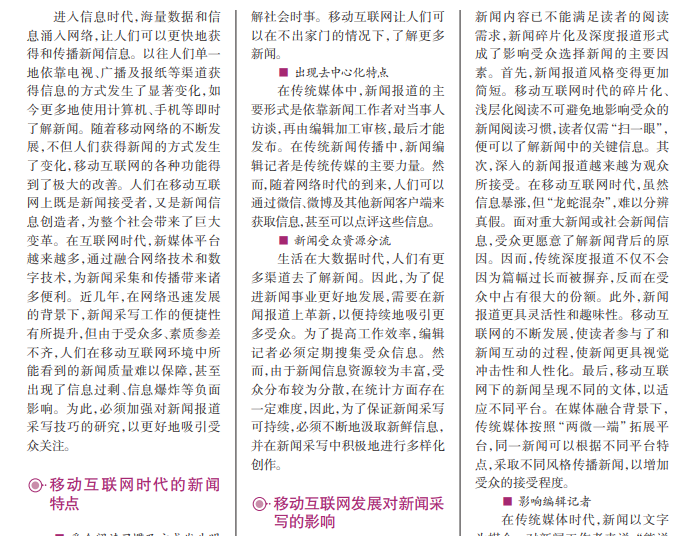 在移动互联网时代,编辑记者必须适应时代发展,既要面对移动互联网所带来的种种问题,又要顺应 时代潮流,寻求更大的发展空间,为受众提供高质量的新闻报道内容。