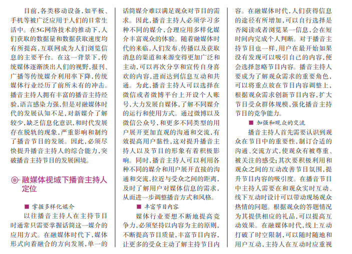 融媒体是一种融合各类媒 介载体的媒体形式,能够充分整 合内容资源、人力资源以及宣传 资源,实现“资源通融、内容兼 融、宣传互融、利益共融”。播音 主持节目是向社会大众传递信 息的重要渠道之一,是传统媒体 的重要表现形式。融媒体时代 的到来给播音主持节目带来了 巨大的冲击。播音主持人是影 响节目质量的关键要素,在新的 时代环境下,主持人需要明确时 代要求,加快个人转型速度,以 适应当代媒体环境。